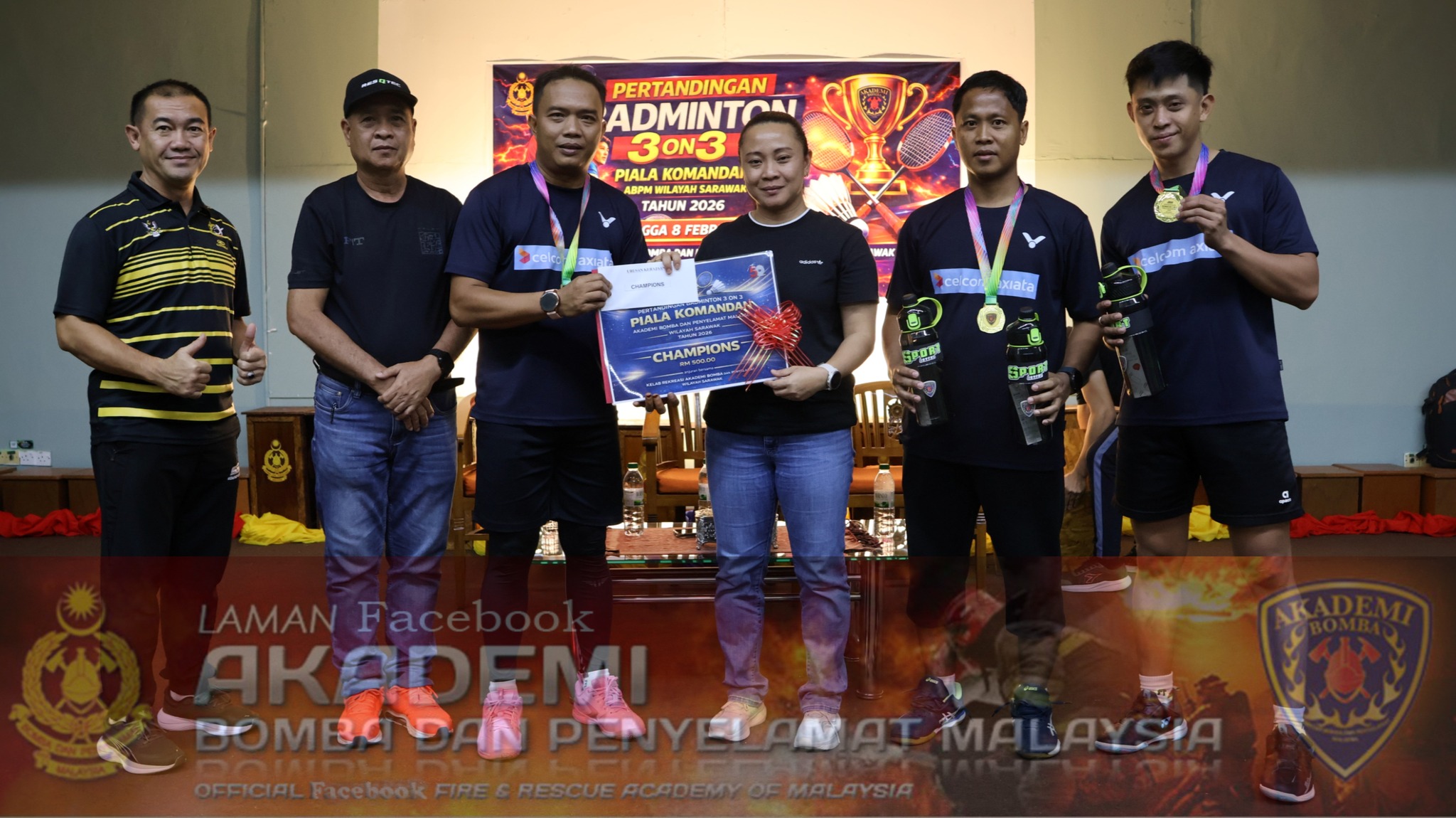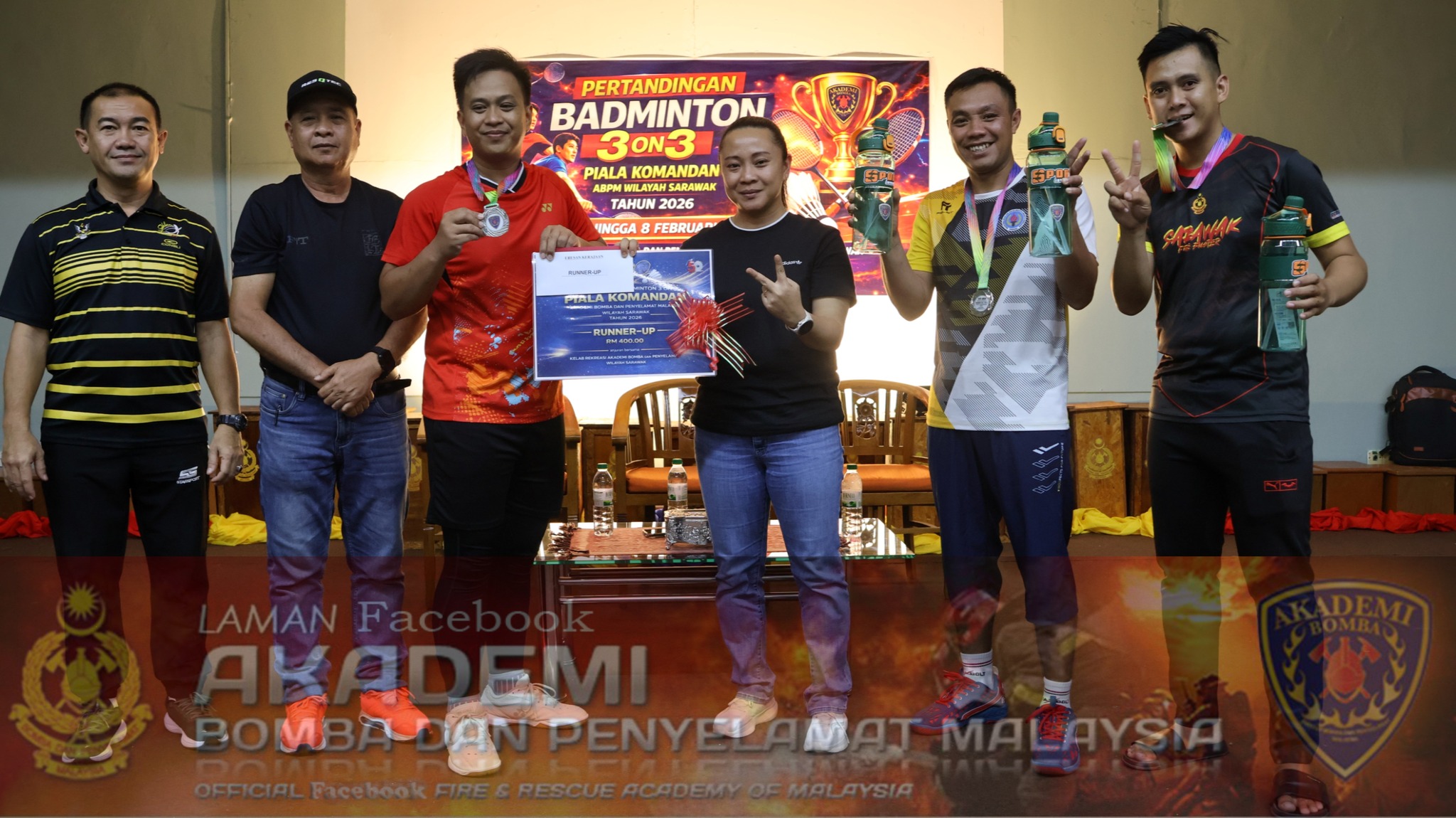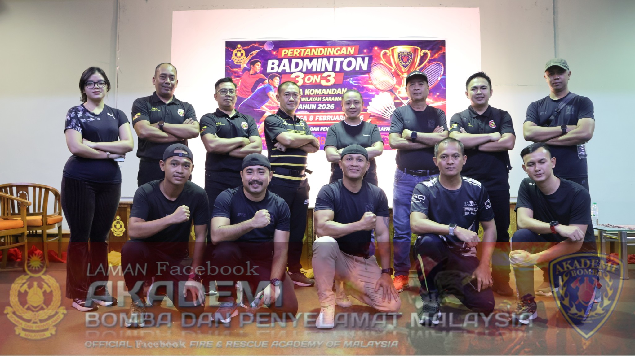 Setinggi-tinggi tahniah dan syabas diucapkan kepada semua pasukan yang telah menyertai Pertandingan Badminton 3 on 3 Piala Komandan Akademi Bomba dan Penyelamat Malaysia, Wilayah Sarawak bagi tahun 2026 yang telah berlangsung pada 7 hingga 8 Februari 2026 bertempat di Akademi Bomba dan Penyelamat Malaysia (ABPM) Wilayah Sarawak.