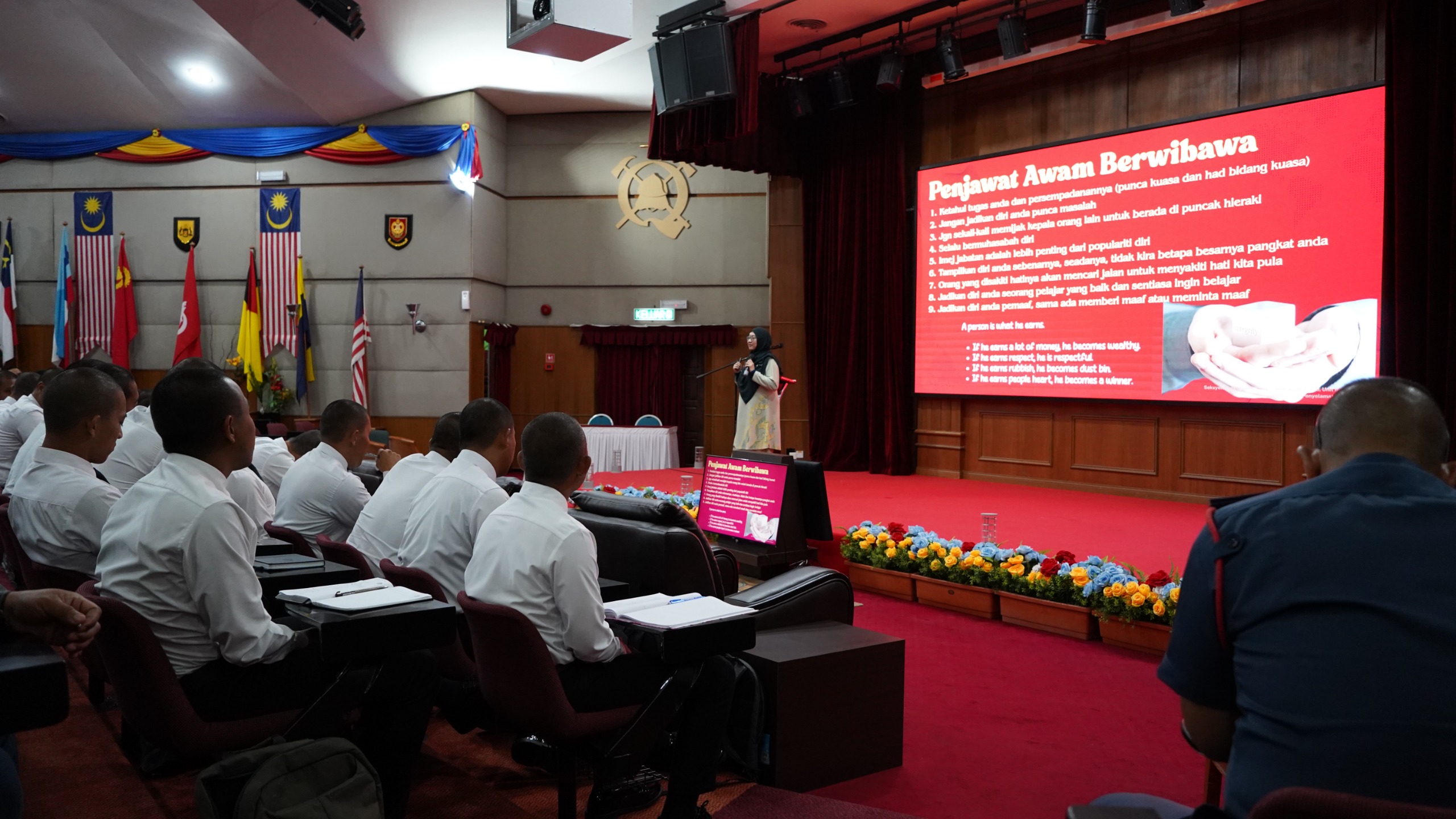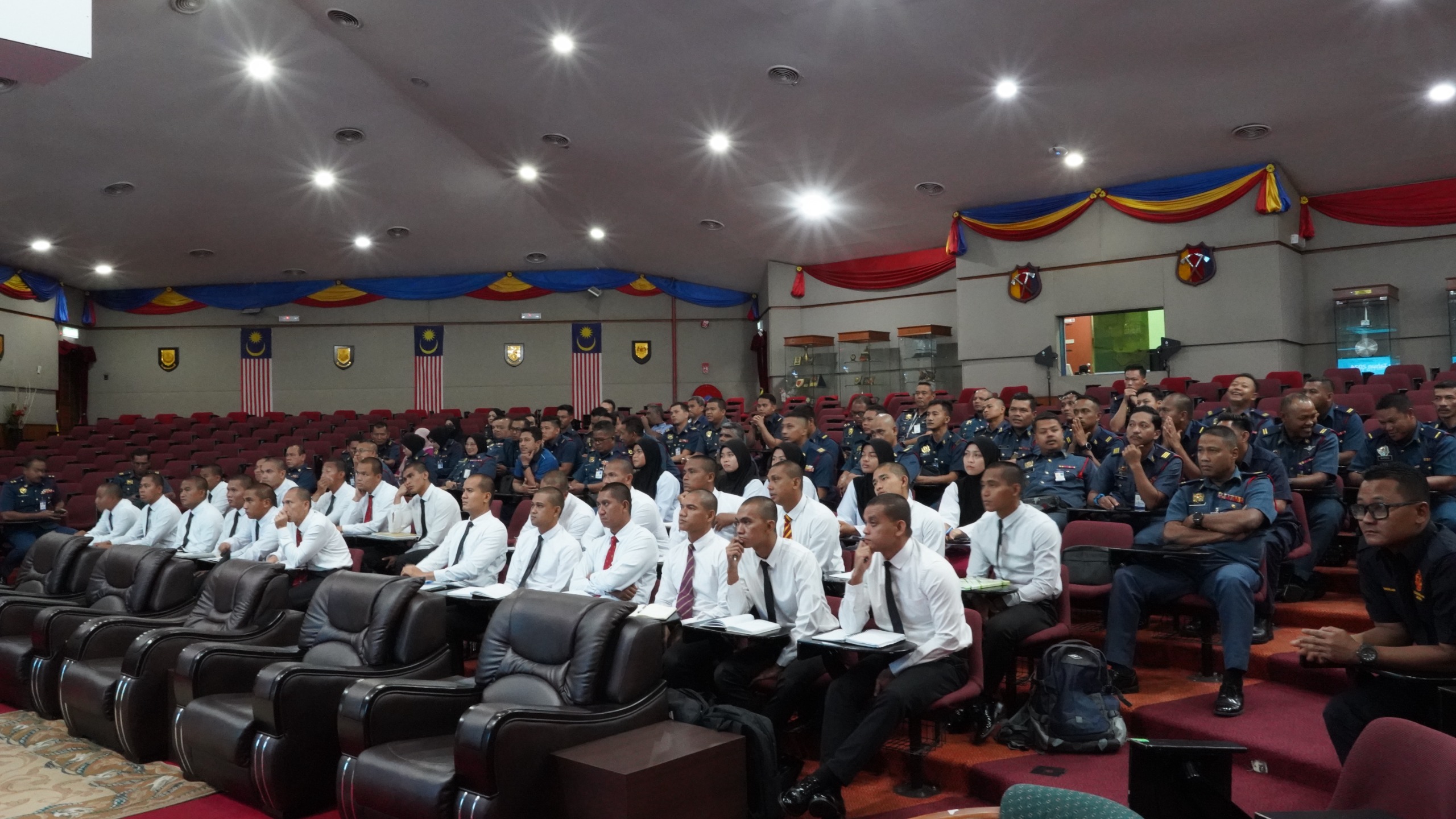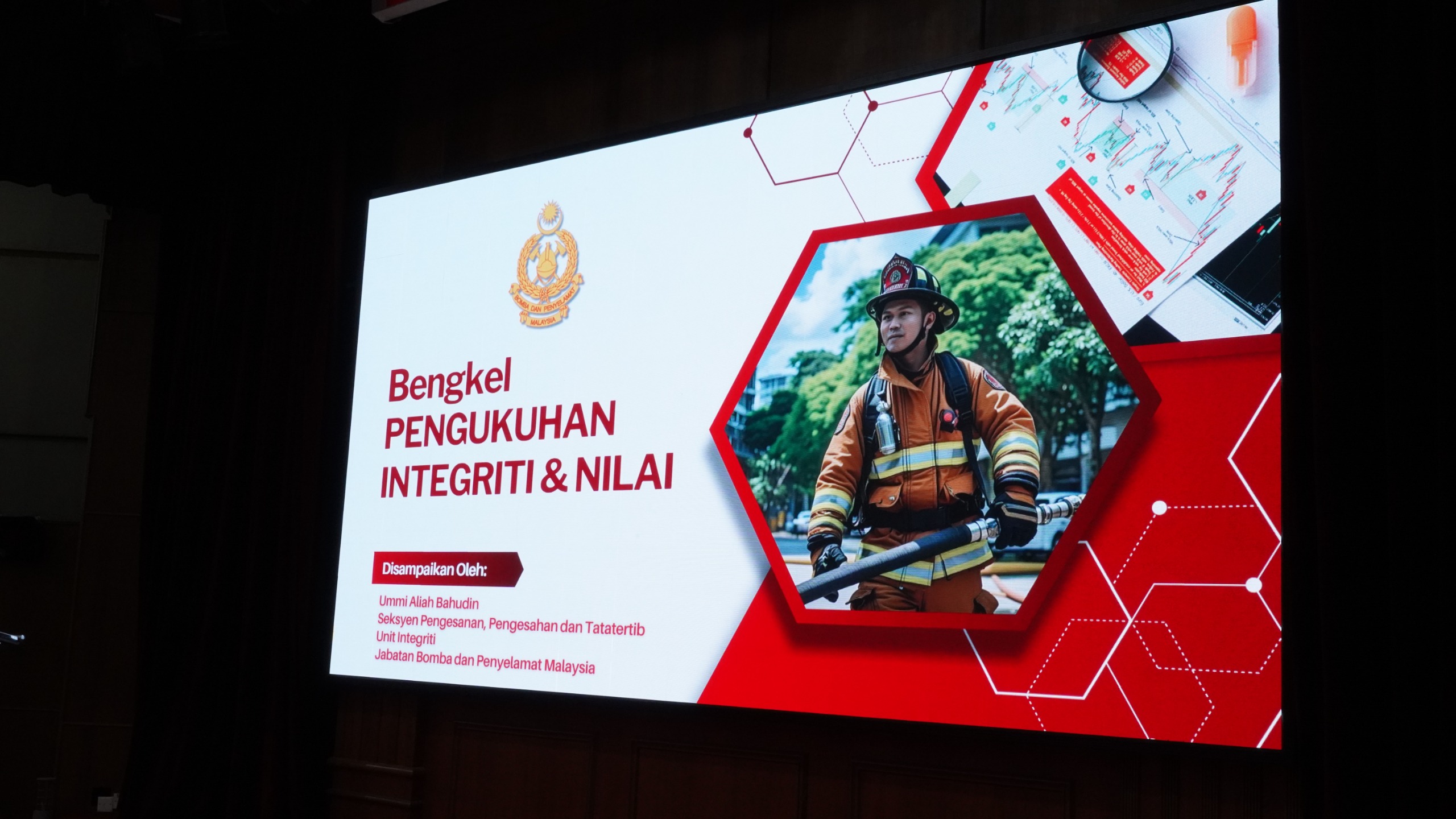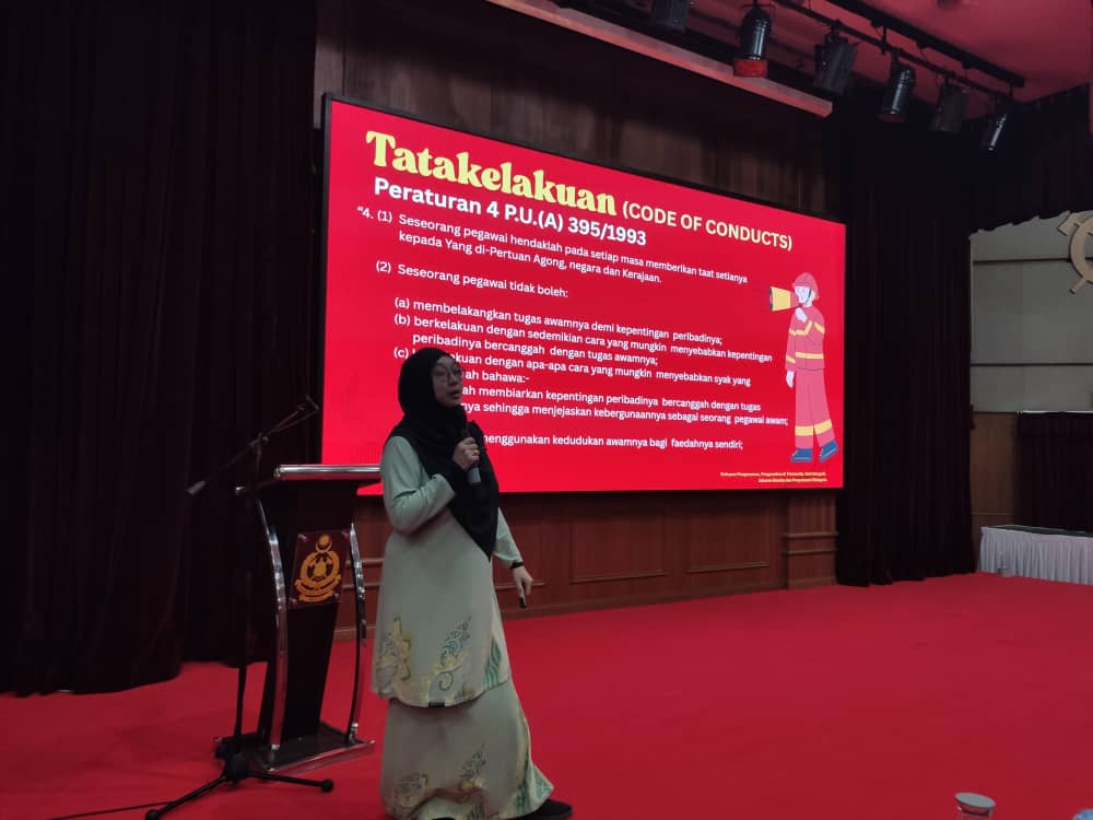 16 OKTOBER 2025 – Seramai 30 pelatih bomba bersama 86 pegawai dan staf Akademi Bomba dan Penyelamat Malaysia (APBM) Wilayah Tengah telah menyertai Bengkel Pengukuhan Integriti dan Nilai yang diadakan di sini, hari ini. Bengkel yang bermula jam 8:30 pagi itu menampilkan penceramah dari Unit Integriti JBPM, Puan Ummi Aliah Binti Bahudin. Beliau menekankan kepentingan akauntabiliti, disiplin, dan tanggungjawab sebagai seorang penjawat awam. Para peserta didedahkan dengan Peraturan-Peraturan Pegawai Awam 1993 [P.U.(A) 395/1993] serta peranan penyelia dalam mengawasi tatatertib melalui Sistem Kawalan Akauntabiliti dan Integriti (SKAI). Puan Ummi Aliah turut mengingatkan bahawa imej jabatan adalah lebih penting daripada populariti diri. Program ini bertujuan memupuk budaya kerja berintegriti tinggi dan berakhir pada jam 12:30 tengah hari.