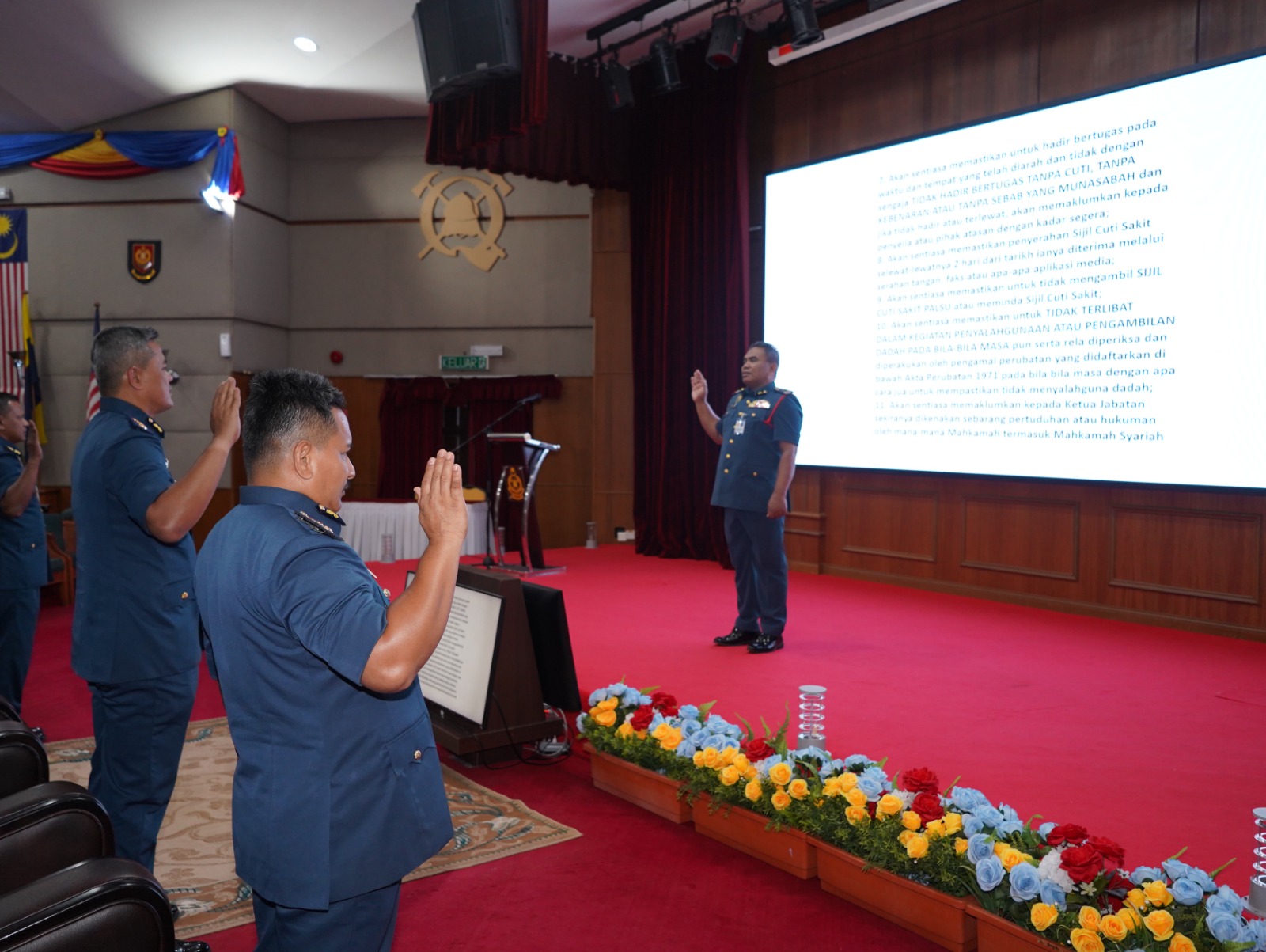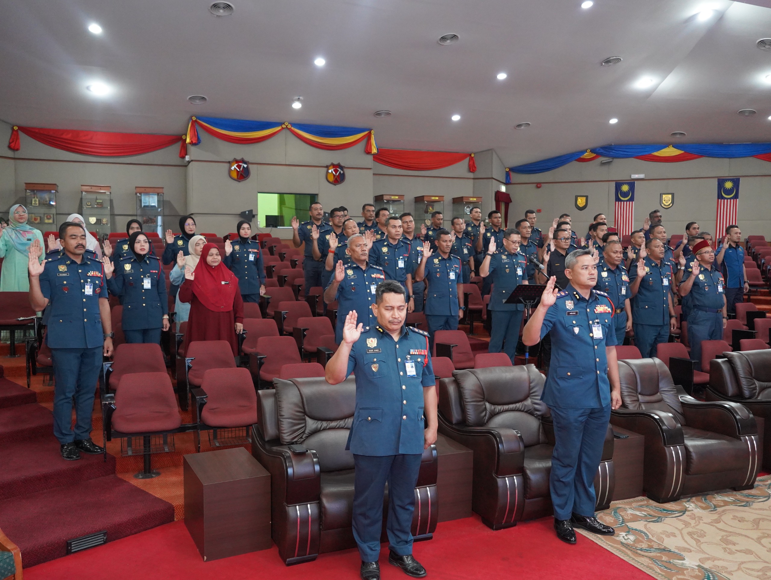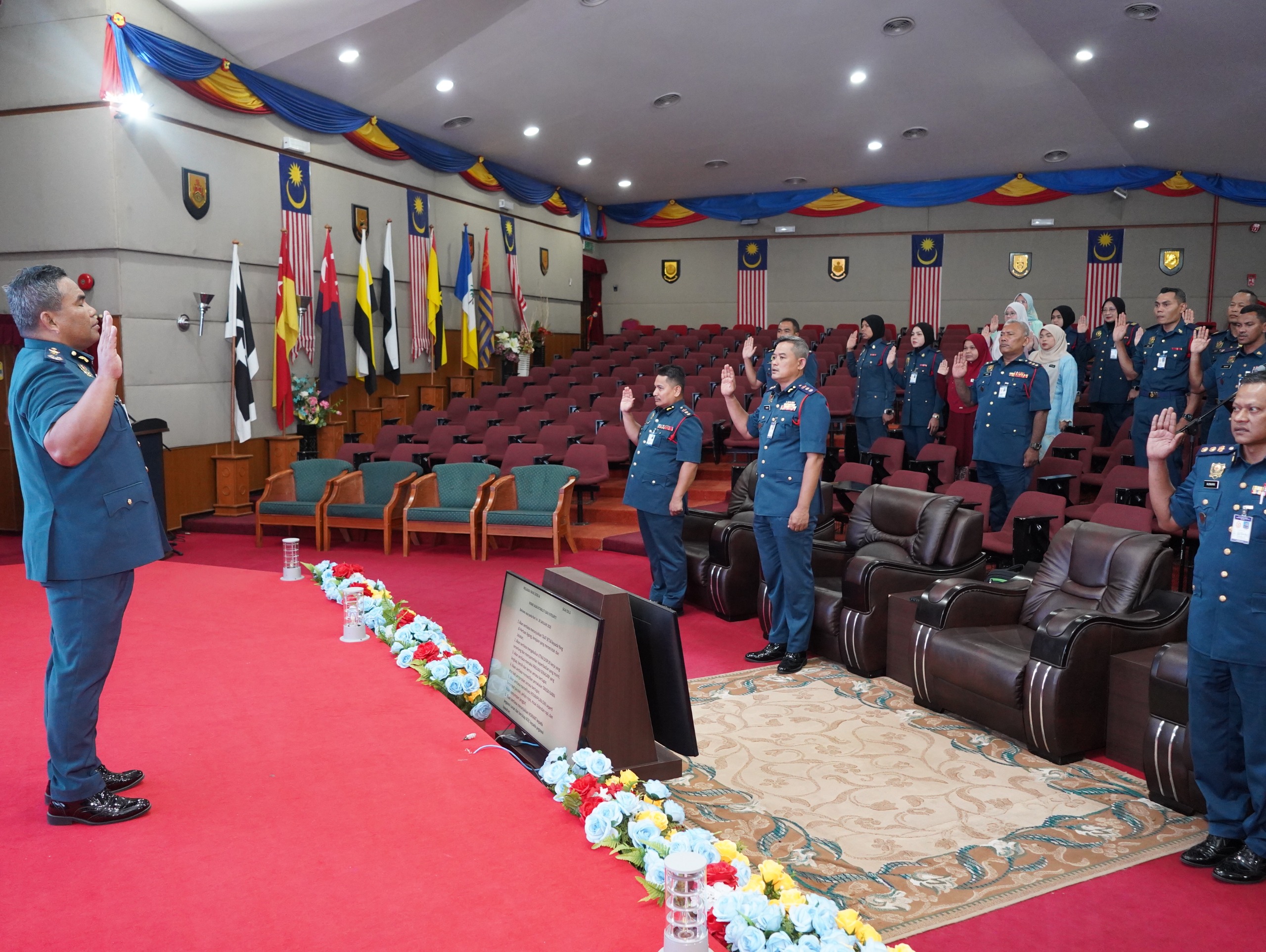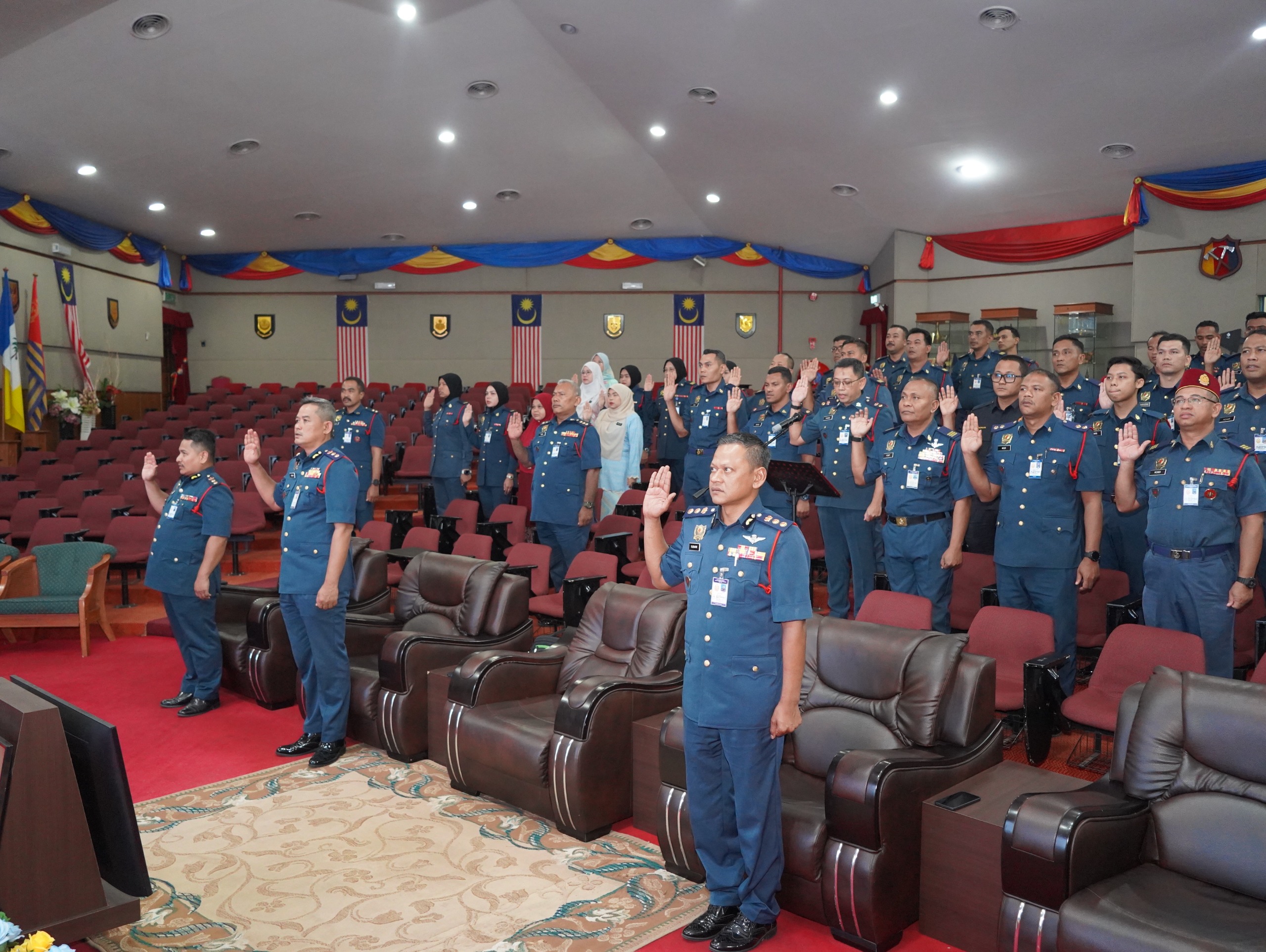 Majlis yang dihadiri oleh semua pegawai dan kakitangan ini menyaksikan sesi bacaan ikrar yang dipimpin oleh Pegawai Adjutant, PgKB I Shamsul Nizar bin Zubir, sebagai simbol komitmen teguh terhadap amanah Jabatan.